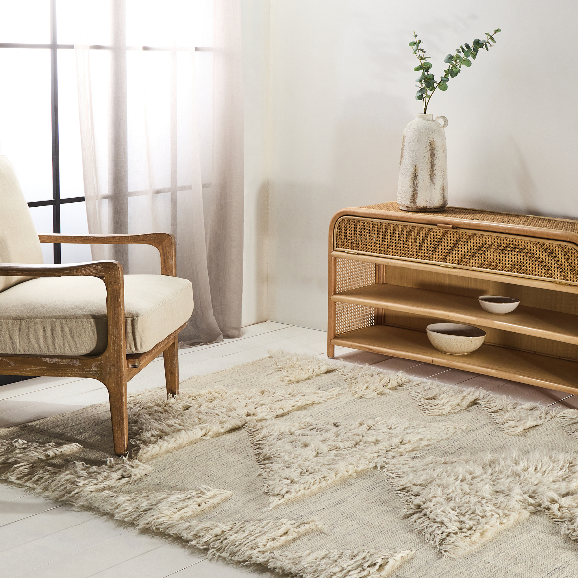 - Warm up wooden floors – adding rugs with natural textures underfoot not only softens a room but creates a more intimate, seasonal atmosphere.